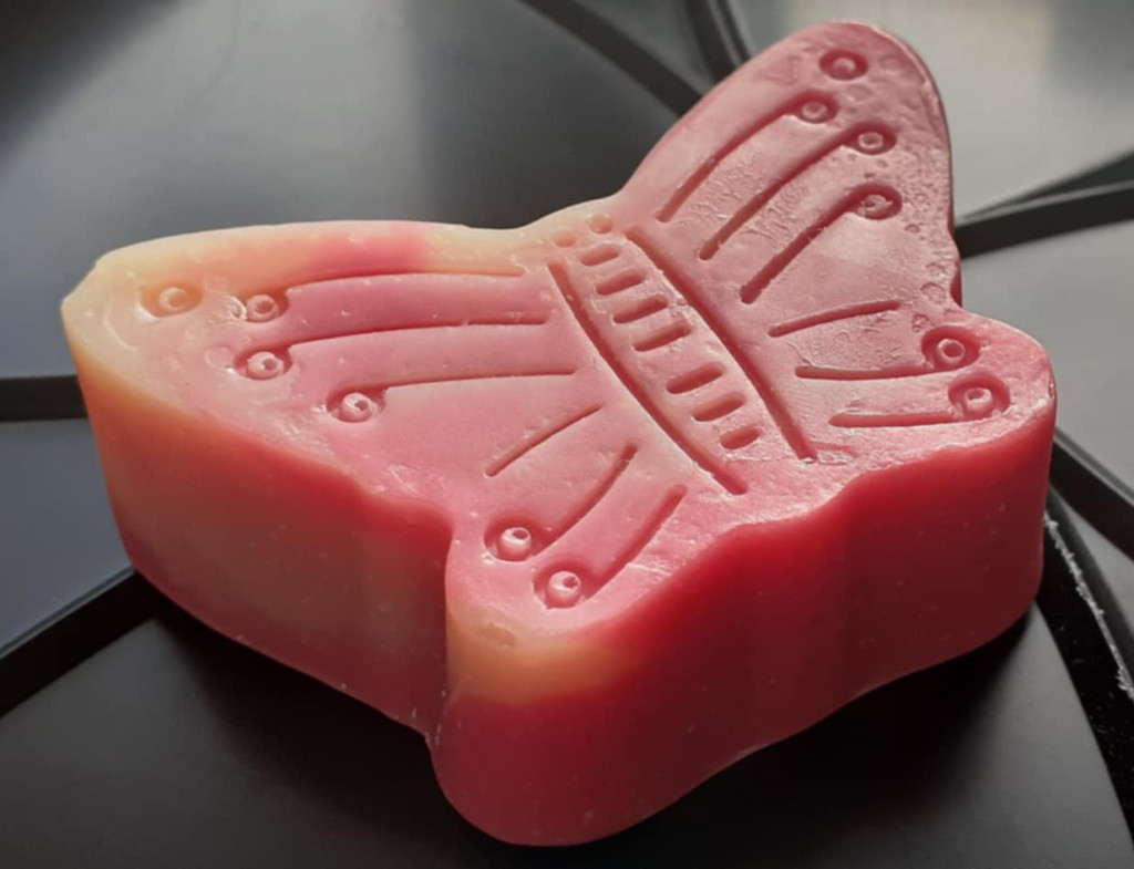 Ingredients: coconut oil, olive oil, animal fat, 100% natural ylang ylang-cinnamon-patchouli essential oils, mica (mineral coloring) starch, distilled water, sodium lactate, glycerin*
