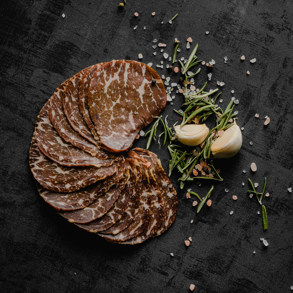 Füstölt marha sonka szeletelve Füstölt -érlelt csemege, igazi ínyenceknek. 100% marha.