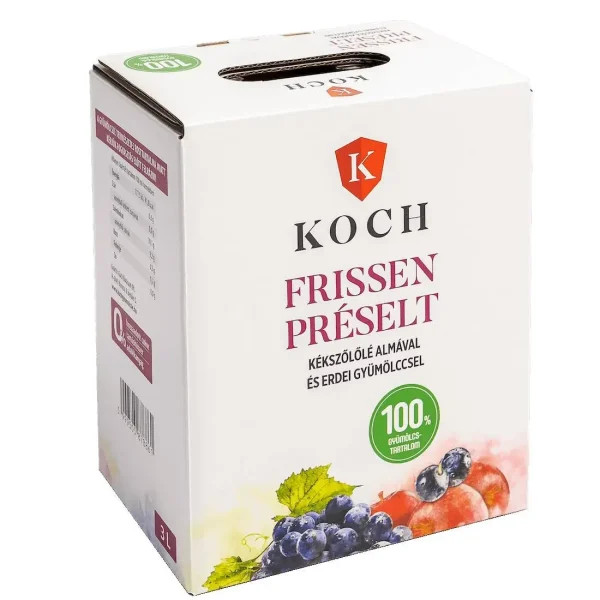 Koch Kékszőlőlé almával és erdei gyümölccsel friss préselésű 100%-os rostos gyümölcsital. Hozzáadott cukor, tartósítószer, és adalékanyag mentes termék. 100%-os gyümölcslé pasztőrözött, frissen préselt gyümölcsből. A gyümölcsök feldolgozása hűtve történik, majd a hideg préselést pasztőrözés és palackozás követi. Gyümölcsleveink „vörös” tagja ez a friss, élénk színű rostos ital, mely Kékfrankos szőlőléből, almaléből és erdei gyümölcsökből készült. Illatában megjelennek a Kékfrankos aromajegyei, mely mind borászatunk, mind Magyarország meghatározó, fő kékszőlő-fajtája. E fűszeres karakterű, savhangsúlyos fajta elsődleges aromái főként a piros bogyós gyümölcsös jegyek, mint például a ribizli, a málna és a szeder. Ezt a friss Kékfrankos mustot házasítottuk Summared és Gála almával, valamint erdei gyümölcsökkel. Az erdei gyümölcsök alacsony kalóriatartalmúak, kiváló antioxidánsok, gazdagok C vitaminban és ásványi anyagokban. Ez a termék egy igazi vitaminbomba. A gyümölcslé szűretlen, ezért üledék képződhet a rosttartalom miatt a palackban. A termék ára a betétdíjat tartalmazza.