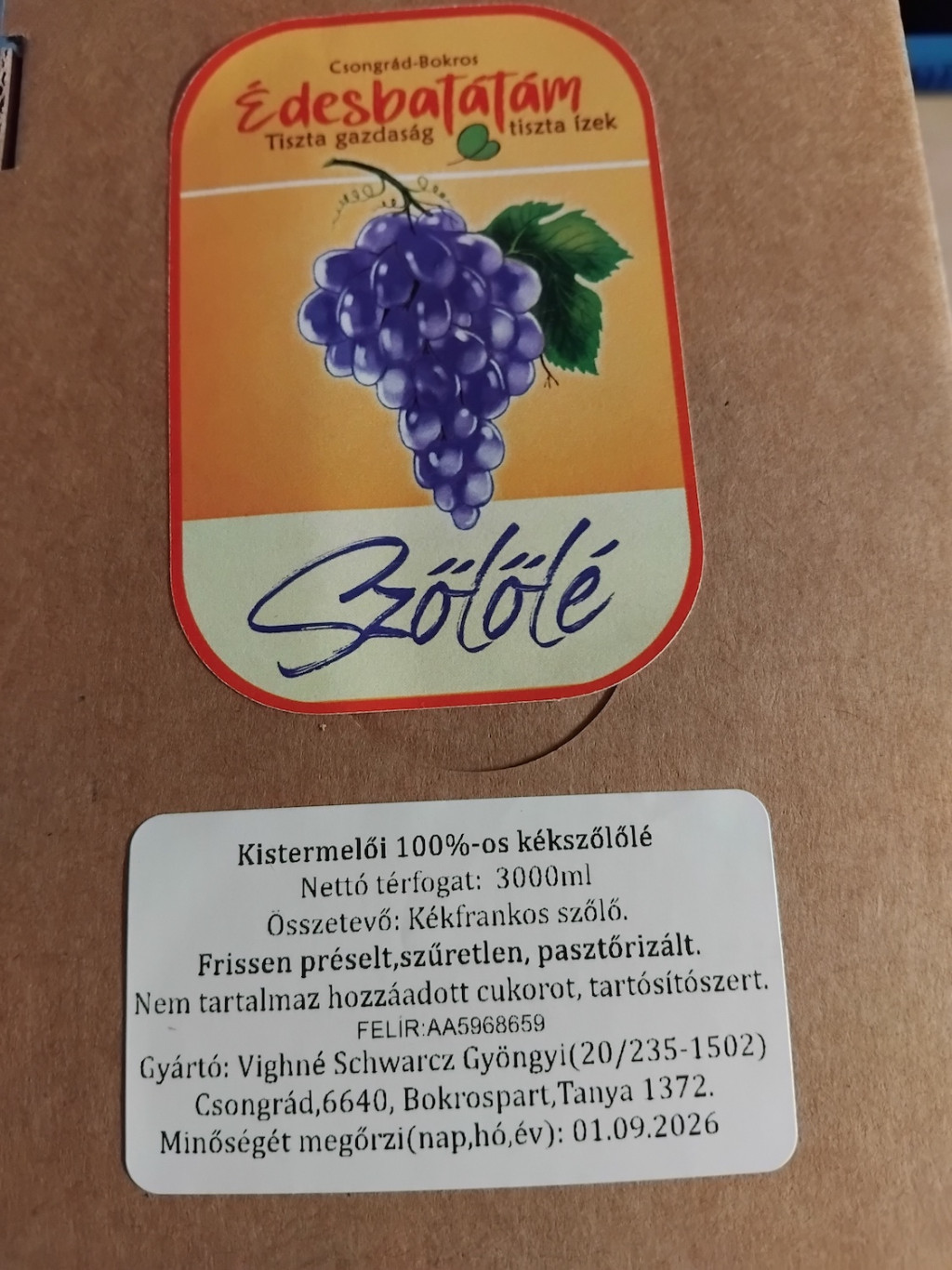 Kistermelői Hőkezelt 100%-os KÉKSZŐLŐLÉ Nettó tömeg: 3000ml Összetevők: Kékfrankos szőlő. Frissen préselt, szűretlen, pasztőrizált. Saját termesztésű, homoki vegyszermentes csongrád-bokrosi szőlőből. 100%-os, így higítható még felesben is. Nem tartalmaz hozzáadott cukorot, tartósítószert! Bag in box kiszerelésben felbontás után 60 napon belül elfogyasztandó.