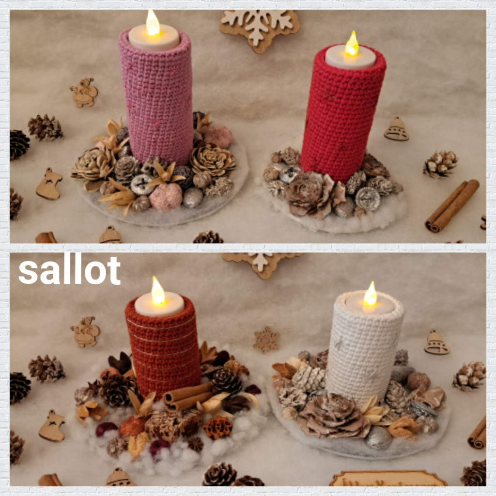 Közeledő ünnepekre hangolódva, fogadjátok szeretettel :-) Horgolt gyertya asztaldíszt készítettem, ledes mécsessel a biztonság kedvéért. Ajánlom otthonra, irodába, tárgyalóba, munkahelyre, orvosi várókba, üzlet kirakatába, osztályterem díszének. Egyedi ajándéknak vagy saját részre is tökéletes dekoráció. Más színű horgolt gyertyával rendelni lehet sallothorgolas.hu honlapomon található elérhetőségeimen. Méretek: lila - átmérő 15 cm, gyertya magasság 14 cm tégla - átmérő 15 cm, gyertya magasság 11 cm fehér - átmérő 15 cm, gyertya magasság 11 cm piros - átmérő 12 cm, gyertya magasság 14 cm
