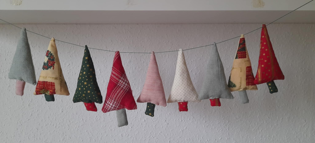 Különböző textil anyagokból varrott, kevés tömőanyaggal térhatásúvá alakított stilizált 9 db fenyőfa a karácsonyi ünnep színviláhában. Kifüggeszthetó füzérként, de egyedileg is felakasztható bútorgombra, kilincsre stb.
