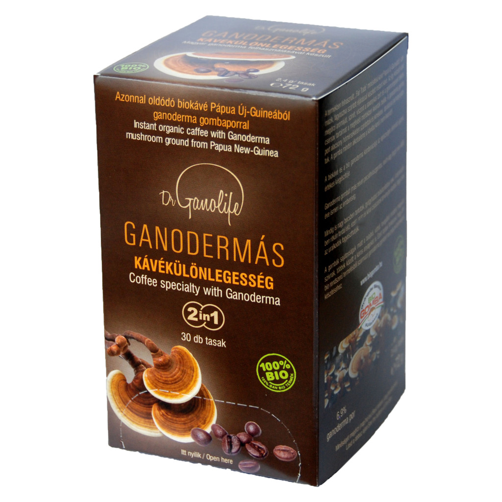 Kiváló minőségű bio-kávébabból és magyar, bio-termesztésű Ganodermagomba-porból készült egészségbarát kávékeverék, mely nem tartalmaz mesterséges színezőanyagokat és tartósítószereket. Összetevők: instant kávé*, ganoderma őrlemény* (6,9%) * Ellenőrzött ökológiai gazdálkodásból Nettó tömeg: 72 g Nem tartalmaz hozzáadott cukrot, édesítőszert! A ganoderma gombában és a kávéban előforduló természetes szénhidrátot tartarmaz! A termékekben felhasznált, „FairTrade” minősítésű Mount Hagen 100 % ARABICA kávé Pápua Új-Guineából származik, ökológiai módszerekkel termesztett és kézzel szedett kávészemekből. Fagyasztva szárított eljárással készített instant kávé. Az így készülő kávé megőrzi az aromáját, színét, viszont a savanykás ízért és a gyomorégésért felelős csersav tartalmat a megfelelő mértékben kivonták belőle. Tápérték 100 g termékben: Energia 852 KJ, 203 Kcal; Zsír 0,5g (amelyből telített zsírsavak 0,2 g); Szénhidrát 19,3g (amelyből cukrok 5,7g); Fehérje 19,3 g; Só < 0,1 g. A tápértéktáblázatban feltüntetett adatok tájékoztató jellegűek, ingadozásuk előfordulhat.