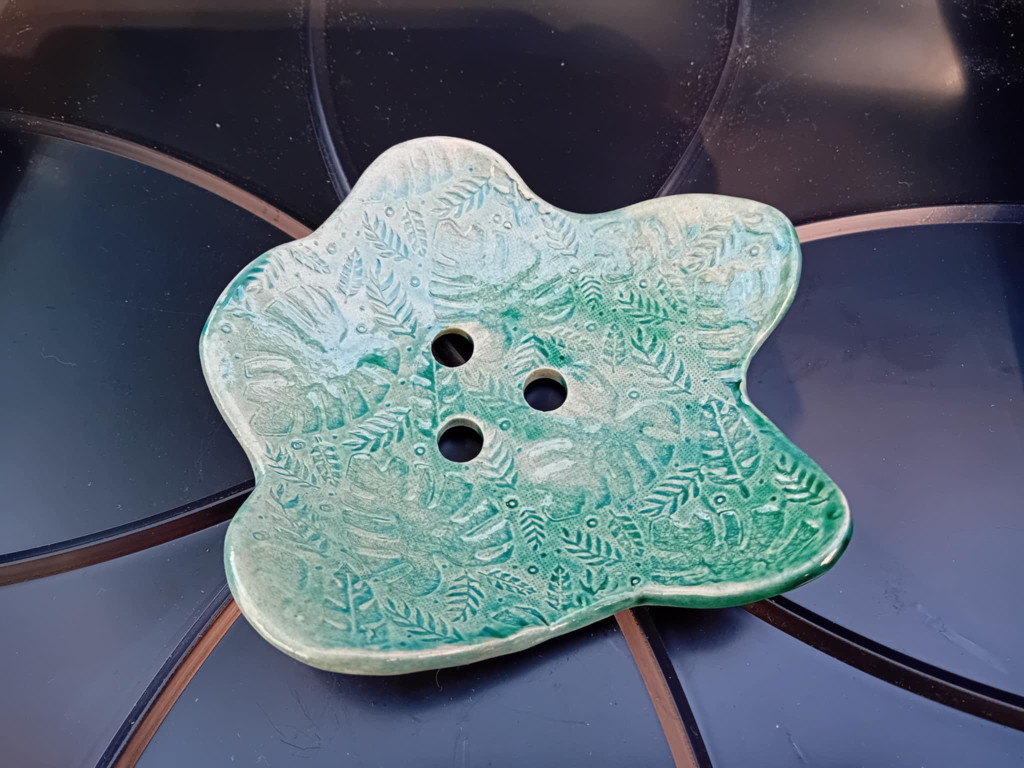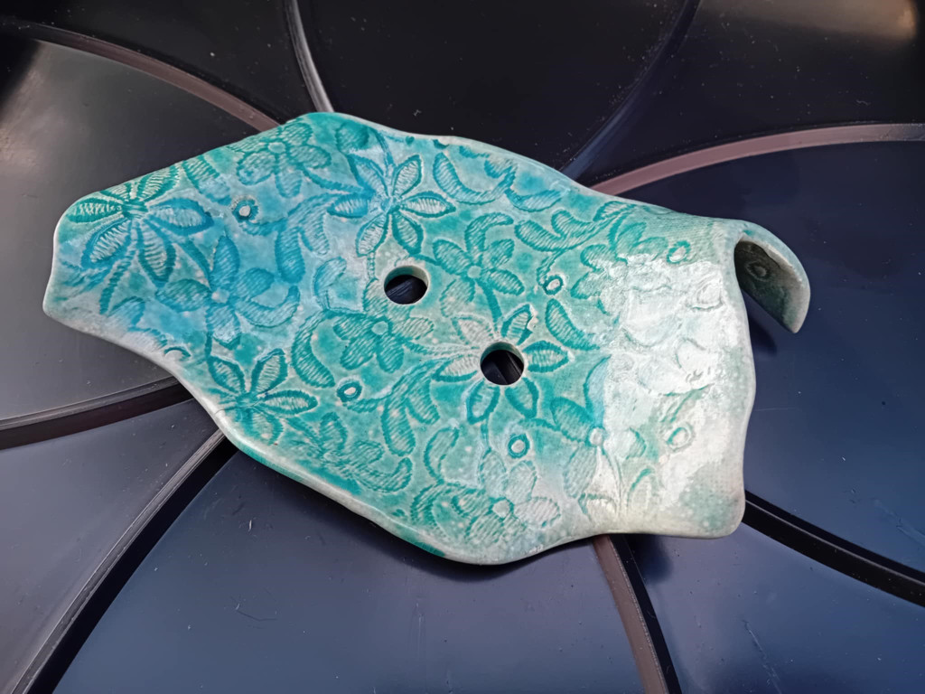 Egyedi mázas kerámia szappan/ékszertartó hazai keramikus mesterektől. Különleges belső lyukasztott kiképzésének köszönhetően a szappan nem ázik a tartófelületen. Mosogatógépben is tisztítható.  Méret adatok Magasság : 2,5 cm Átmérő : 13 cm Összetétel : mázas kerámia