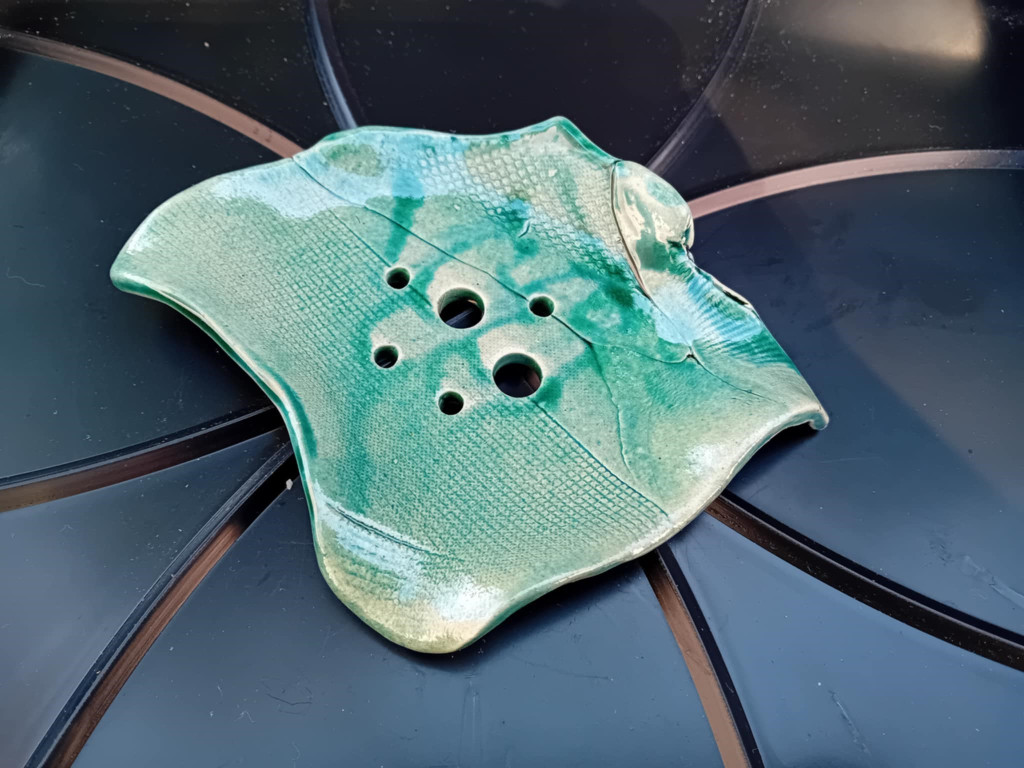 Egyedi mázas kerámia szappan/ékszertartó hazai keramikus mesterektől. Különleges belső lyukasztott kiképzésének köszönhetően a szappan nem ázik a tartófelületen. Mosogatógépben is tisztítható.  Méret adatok Magasság : 2,5 cm Átmérő : 14 X 11 CM Összetétel : mázas kerámia